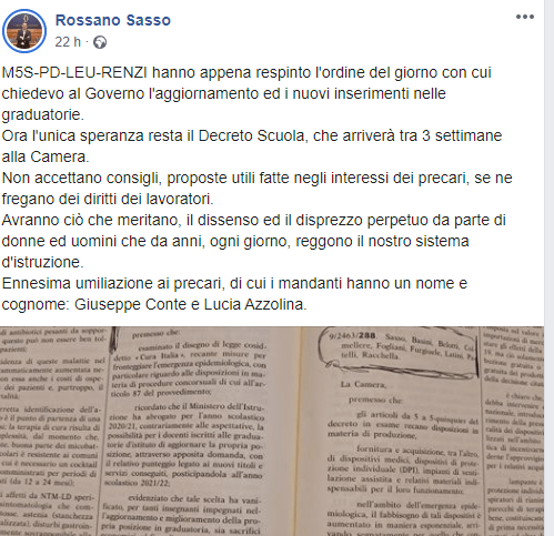 A breve distanza di tempo, in un post sulla propria pagina, l’onorevole Rossano Sasso della Lega scriveva: “M5S-PD-LEU-RENZI hanno appena respinto l’ordine del giorno con cui chiedevo al Governo l’aggiornamento ed i nuovi inserimenti nelle graduatorie. Ora l’unica speranza resta il Decreto Scuola, che arriverà tra 3 settimane alla Camera“.