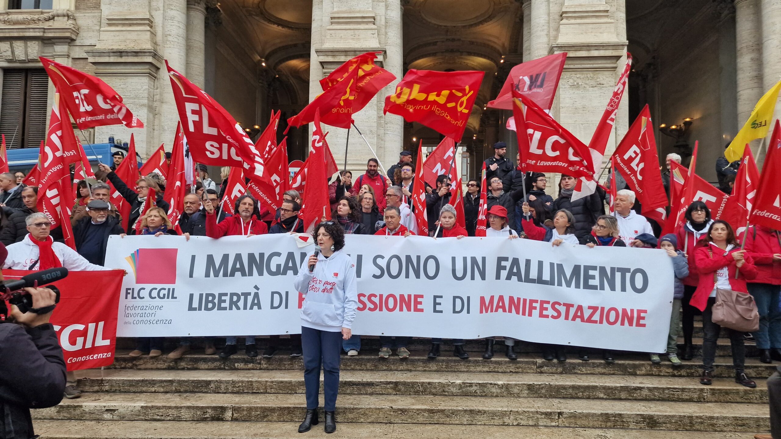 “I manganelli sono un fallimento” recita uno striscione esposto dalla Flc Cgil. Queste le parole della segretaria generale Gianna Fracassi: “Abbiamo appena concluso il presidio che si è tenuto questa mattina sotto il ministero dell’Istruzione per rivendicare il diritto dei ragazzi e delle ragazze a manifestare liberamente, per affermare con forza che la libertà di manifestazione è un presidio del nostro sistema democratico e che non va repressa con il manganello verbale né con quello fisico. Non è accettabile né il silenzio che abbiamo ascoltato da esponenti del governo ma neppure affermare che queste sono manifestazioni non autorizzate, insomma mettere delle ambiguità. Avremmo gradito molta più nettezza da parte della stessa presidente del Consiglio, la violenza non paga e non paga soprattutto nella relazione coi più giovani”.