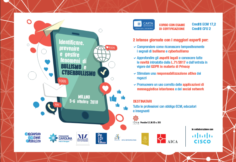 A un anno dall’entrata in vigore della Legge 71/2017 “Disposizioni a tutela dei minori per la prevenzione ed il contrasto del fenomeno del cyberbullismo in tutte le sue manifestazioni” e con l’introduzione delle nuove norme introdotte dal GDPR in materia di privacy nuove responsabilità investono educatori e professionisti chiamati a rispondere concretamente ai bisogni di prevenzione, sensibilizzazione e diritto alla cura di bambini e ragazzi coinvolti in episodi di bullismo e cyberbullismo.