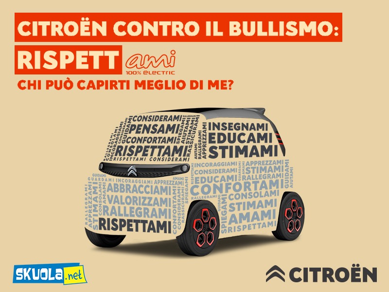 Ma l’Osservatorio “Bullismo e Cyberbullismo” è solo il primo passo del progetto “RispettAMI”, ideato da Citroën Italia e coordinato da Skuola.net. Un’iniziativa concreta, per promuovere attivamente, nelle scuole e fra gli studenti, la cultura del rispetto come strumento di contrasto ai fenomeni devianti connessi al bullismo. Uno dei passaggi chiave è proprio il back to school 2022: si parte con un progetto pilota che coinvolgerà circa 500 studenti delle Scuole Secondarie di II grado che, una volta “debullizzate” le loro classi, successivamente diventeranno ambassador di una campagna di comunicazione contro bullismo e cyberbullismo, online e “sul campo”, che prevede di raggiungere almeno mezzo milione di adolescenti su Skuola.net e sui rispettivi canali social. Infatti, in ogni classe coinvolta verranno nominati degli studenti referenti per il contrasto al bullismo, che avranno il compito di coadiuvare i propri docenti nel costante monitoraggio del fenomeno, applicando il protocollo ideato da “MaBasta” (Movimento Anti Bullismo Animato da Studenti Adolescenti), una onlus fondata dagli studenti per aiutare i loro pari a combattere le prevaricazioni tra coetanei, attraverso il coinvolgimento dell’intero gruppo classe – docenti inclusi – con il supporto di giovani peer educator.
