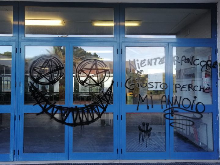 Sull’ingresso dell’istituto, nella notte tra il 7 e l’8 novembre, è stato fatto un disegno, con la vernice spray nera, accanto al quale è comparsa una scritta: “Niente rancore, giusto perché mi annoio”. L’autore del gesto riprovevole, che rimane ignoto, ha voluto ironizzare sulla faccenda, prendendo praticamente in giro chi, la mattina dopo, si è trovato davanti la brutta sorpresa all’ingresso a scuola.