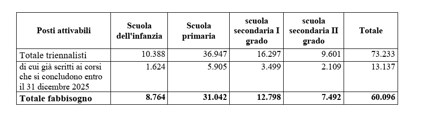 Nell’Allegato B al decreto ci sono i numeri relativi al fabbisogno di docenti, che corrisponde al numero di docenti che negli otto anni precedenti hanno svolto nelle istituzioni scolastiche statali e paritarie, alla data del 31 agosto 2025, un servizio su posto di sostegno della durata di almeno tre anni scolastici, anche non continuativi, sul medesimo grado di istruzione.