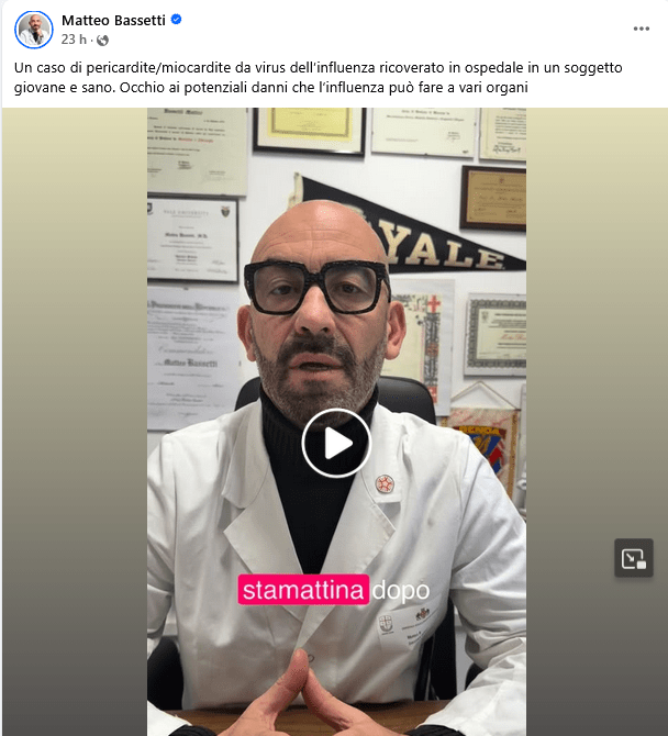A ricordarlo è Matteo Bassetti, direttore della Clinica di Malattie infettive dell’Irccs San Martino di Genova, che sui social segnala il caso di un ventenne ricoverato nel policlinico ligure per un’infezione da H3N2 – il virus influenzale attualmente più diffuso – complicata da pericardite e miocardite. Un episodio che, sottolinea l’infettivologo, conferma come il virus possa estendersi oltre le vie respiratorie: “Può colpire i polmoni, ma anche cuore e reni”, spiega, ricordando che il giovane paziente, pur essendo sano, ha sviluppato una forma severa, sebbene al momento non in condizioni critiche.