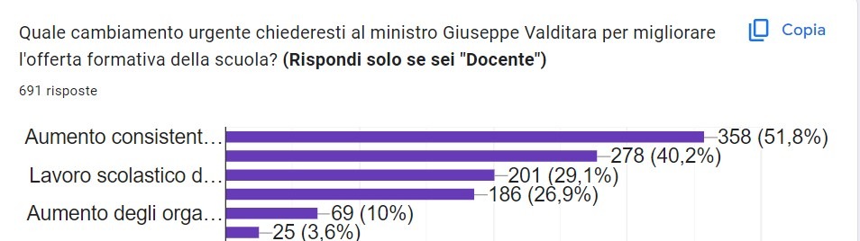 Secondo i risultati del sondaggio realizzato dalla testata giornalistica specializzata, a cui hanno partecipato 740 utenti, quasi tutti insegnanti (92,6%), provenienti in maggioranza dal Nord Italia, la richiesta primaria per il nuovo anno scolastico è quella di un aumento dello stipendio.