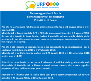 - Inserimento negli elenchi aggiuntivi del sostegno: istanza POLIS mod. A5 dal 20 agosto 2018 al il 10 settembre 2018 (entro le ore 14,00)