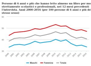Oltre a quello relativo all’uso della lingua, arriva anche il rapporto Istat di fine anno sul consumo dei libri e sull’editoria italiana, e purtroppo i dati non sono molto incoraggianti: solo il 40,5% degli italiani ha dichiarato di aver letto almeno un libro durante l’ultimo anno, 1,5% in meno rispetto al 2015.