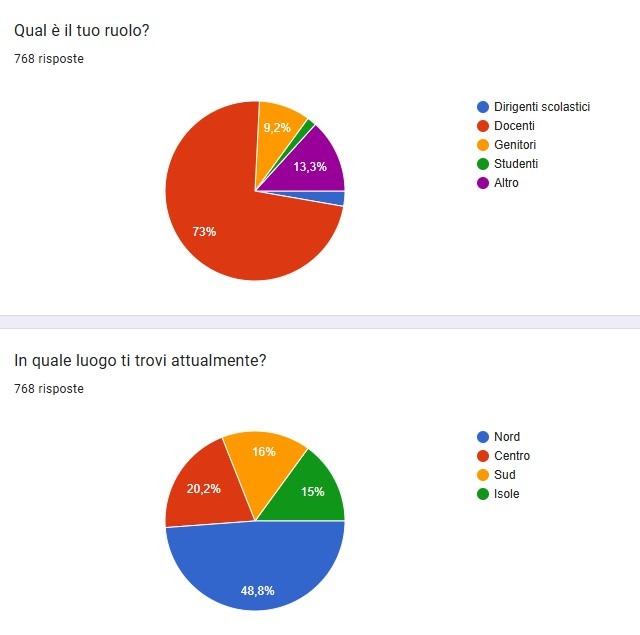 L’indagine ha visto la partecipazione per il 735 di docenti, dirigenti, studenti, genitori e altro. La metà dei partecipanti vive al Nord (48.8%), mentre il resto è diviso equamente tra Centro, Sud e Isole.