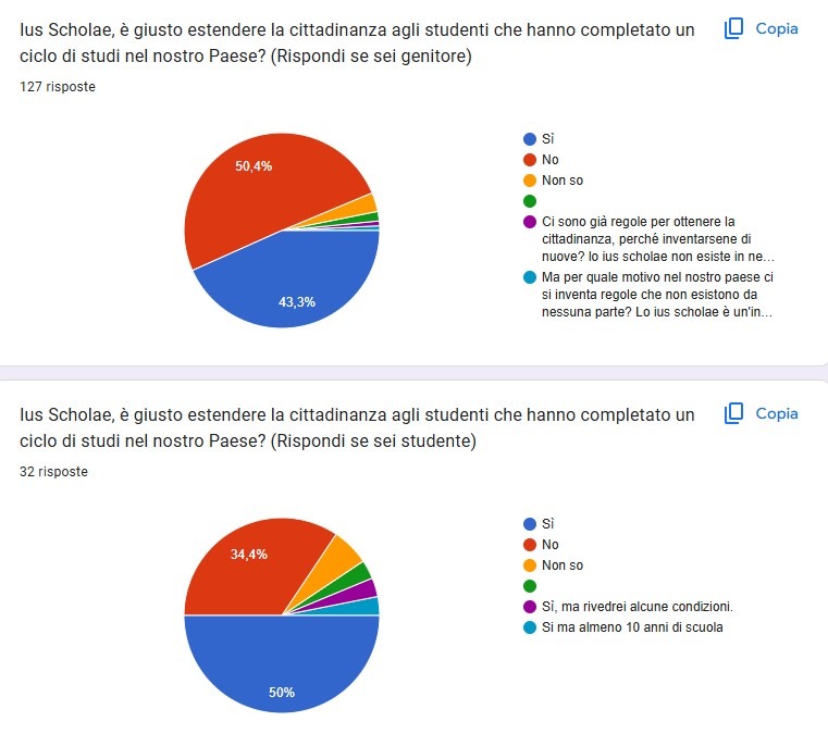 Qui di seguito alcuni commenti dei componenti delle famiglie degli studenti: “Ci sono già regole per ottenere la cittadinanza, perché inventarsene di nuove? lo ius scholae non esiste in nessuna parte del mondo!”; “Ma per quale motivo nel nostro paese ci si inventa regole che non esistono da nessuna parte? Lo ius scholae è un’invenzione di qualche politico che evidentemente ha preso troppo sole!”.