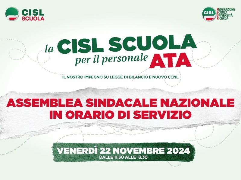 Maggiori approfondimenti su questi come su altri temi di rilievo, legati al confronto in atto sulla legge di bilancio e all’imminente ulteriore rinnovo contrattuale potranno venire dalla assemblea sindacale nazionale del personale ATA che la CISL Scuola ha indetto per venerdì 22 novembre dalle 11.30 alle 13.30. Un’assemblea in modalità a distanza, che potrà essere seguita in diretta sul canale YouTube della CISL Scuola, collegandosi all’indirizzo indicato sulla locandina allegata.