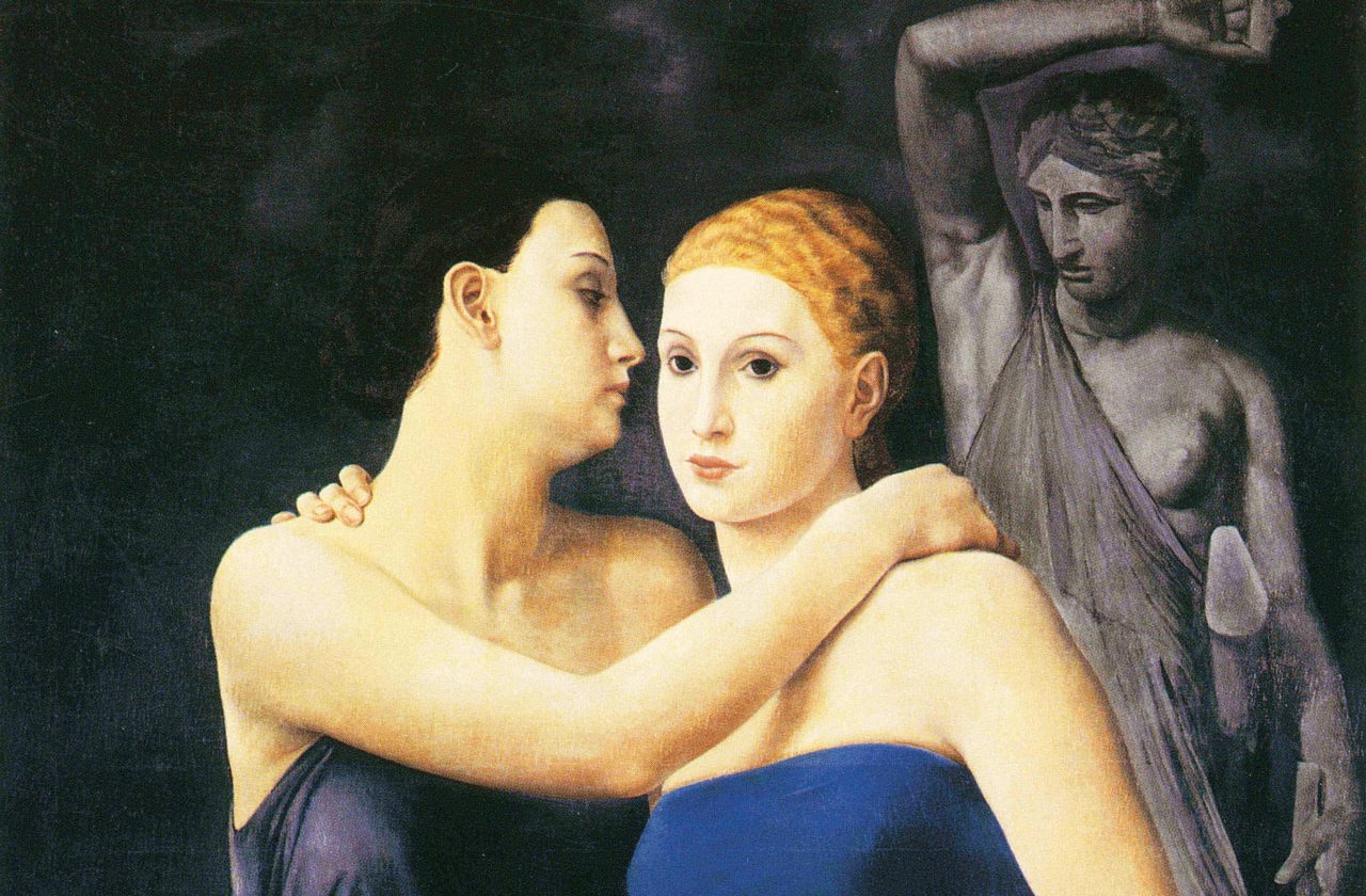 Ubaldo Oppi (Bologna 1889-Vicenza 1942) visse intensamente gli anni della Belle Époque prima del conflitto mondiale. Fu a Vienna e a Parigi, il principale laboratorio delle avanguardie, dove soggiornarono tutti gli artisti del momento. Allo scoppio della prima guerra mondiale, combatté come alpino. Negli anni Venti si trasferì a Milano, e qui ebbe inizio la seconda stagione pittorica, cui appartengono le opere più famose. Dal 1922 al 1924 aderì al movimento artistico “Novecento”, che, guardando al classicismo della trazione italiana del Quattrocento e del Rinascimento, rende la figura umana plastica e robusta, carnosa e sensuale quella femminile. Tuttavia l’atmosfera è ben diversa dalla classicità, si percepiscono le inquietudini dell’epoca, si rappresentano alcuni temi scandagliati anche in letteratura, come quello del doppio. Il soggetto si staglia su sfondi naturalistici o su scenari immobili, sospesi, quasi metafisici. È la fase del “Realismo magico”, cui appartengono diverse opere, quali “Le amiche” del 1924, diventato il manifesto della mostra, e il “Ritratto della moglie sullo sfondo di Venezia” del 1921, tutto sui toni del verde acqua, dal mare all’abito della donna, della quale risalta l’incarnato chiaro e luminoso, l’eleganza curata nei minimi particolari e l’aria dolce e serena.