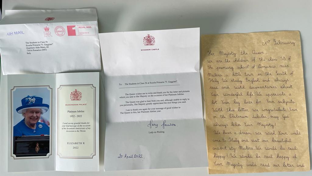 Ha spiegato la dirigente scolastica, Caterina Policaro: “Era il 21 febbraio scorso quando le bambine e i bambini della classe V B di Pomarico, stimolati dalla insegnante Teresa Tristano, hanno lavorato sul tema dei settanta anni di Elisabetta II, la più longeva regina sul trono d’Inghilterra. Hanno deciso di mandare i loro auguri via air mail, spiegando con la loro immensa semplicità a Elisabetta II come, da una piccola cittadina del sud Italia, avessero approfondito a scuola la cultura britannica, leggendo e vedendo insieme documentari sulla sua fantastica ed eccezionale vita, apprezzando il grandissimo amore per la sua nazione e per i suoi sudditi”.