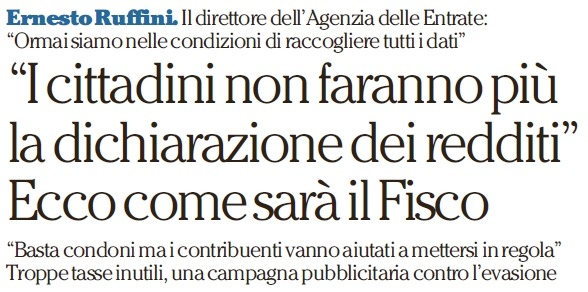 Ecco nel dettaglio le sue dichiarazioni: “Per fortuna siamo in un Paese diverso. Oggi c’è la dichiarazione precompilata. Ma mi piace pensare che sia soltanto un passaggio intermedio fra come eravamo e come saremo. Lunedì ho convocato da Sogei tutti gli intermediari, commercialisti, consulenti del lavoro e gli altri professionisti perché bisogna partire col piede giusto nel tempo giusto per arrivare agli appuntamenti con proposte il più possibile condivise. Il Fisco deve ascoltare, confrontarsi. E cambiare. Accumulando sempre più dati ed evitando naturalmente di chiedere quelli che già abbiamo, deve venir meno il concetto stesso di dichiarazione dei redditi. Nel momento in cui il Fisco possiede tutti i dati, ti presenta l’elaborazione di quegli stessi dati e tu da controllato diventi controllore del fisco. Ti fornisco un servizio e hai il diritto di vedere se ho lavorato bene. Tempi? Direi 5 anni. Trattandosi di un’operazione complessa ritengo che l’orizzonte possibile per l’entrata a regime sia questo”.