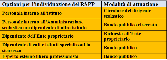 L’articolo 32, comma 8 della legge 81/08, prevede che l’incarico del Responsabile del Servizio di Prevenzione e Protezione (RSPP) vada affidato prioritariamente a personale interno alla scuola, ovvero, in subordine, interno ad un’altra istituzione scolastica, e, in entrambi i casi, che si dichiari disponibile in tal senso. Solo in via sussidiaria (comma 9), cioè nell’impossibilità di ottemperare alla norma secondo una delle due precedenti modalità, il dirigente scolastico può ricorrere a personale esterno all’Amministrazione scolastica. A tal riguardo di seguito si propone una tabella in cui si evidenziano le opzioni per l’individuazione del RSPP.