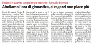 E prosegue: ”Non sarà necessario un sondaggio per avere da tutti la stessa risposta quanto all’importanza delle ore di educazione fisica: sono solo uno svago, un momento di pausa. Ci sarebbero pure le fantomatiche ore di ‘teoria’, in cui bisognerebbe studiare il corpo umano, la muscolatura, lo scheletro, il metabolismo, tutte attività che, se fossero veramente svolte, potrebbero lasciare là dove sono, nei nasi, nelle lingue, tutti i più arditi piercing. Ma chi le fa? E per quante ore a settimana?”