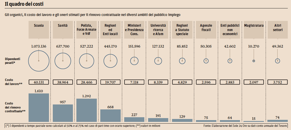 L’aspetto più importante è sicuramente quello del rinnovo del contratto che non interessa solo il comparto scuola/università, ma tutto il pubblico impiego. Il costo dell’operazione complessiva, come riporta Il Sole 24 ore, è di 5 miliardi. Nonostante la sentenza della Consulta che chiede di sbloccare i contratti pubblici fermi dal 2010 ancora si è fatto poco o nulla. I sindacati chiedono aumenti ad hoc. Se un docente guadagna 30mila euro a metà carriera e 37mila a fine, l’obiettivo è quello di avere più soldi sulla parte fissa, ma anche su quella variabile riportando a contrattazione il bonus per l’aggiornamento professionale e quello per il merito a favore dell’avvio di uno sistema di welfare. Non sarà però un capitolo di facile attuazione.