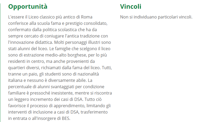 “Il contesto socio- economico e culturale complessivamente di medio- alto livello e l’assenza di gruppi di studenti con caratteristiche particolari dal punto di vista della provenienza culturale (come, ad esempio, nomadi o studenti di zone particolarmente svantaggiate) costituiscono un background favorevole alla collaborazione e al dialogo tra scuola e famiglia, nonché all’analisi delle specifiche esigenze formative nell’ottica di una didattica davvero personalizzata”, si legge invece sul rapporto di autovalutazione del liceo classico D’Oria di Genova, dove viene sottolineato che “Il contributo economico delle famiglie sostiene adeguatamente l’ampliamento dell’offerta formativa”.