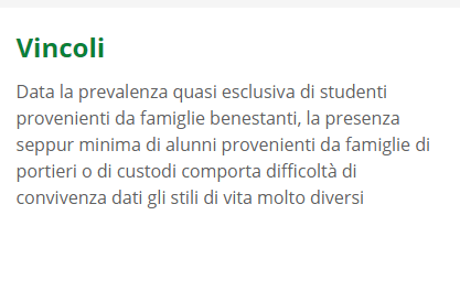 Ma è alla voce Vincoli, nella navigazione del RAV di Scuola in Chiaro, che appare la descrizione più incredibile: “Data la prevalenza quasi esclusiva di studenti provenienti da famiglie benestanti, la presenza seppur minima di alunni provenienti da famiglie di portieri o di custodi comporta difficoltà di convivenza dati gli stili di vita molto diversi“.