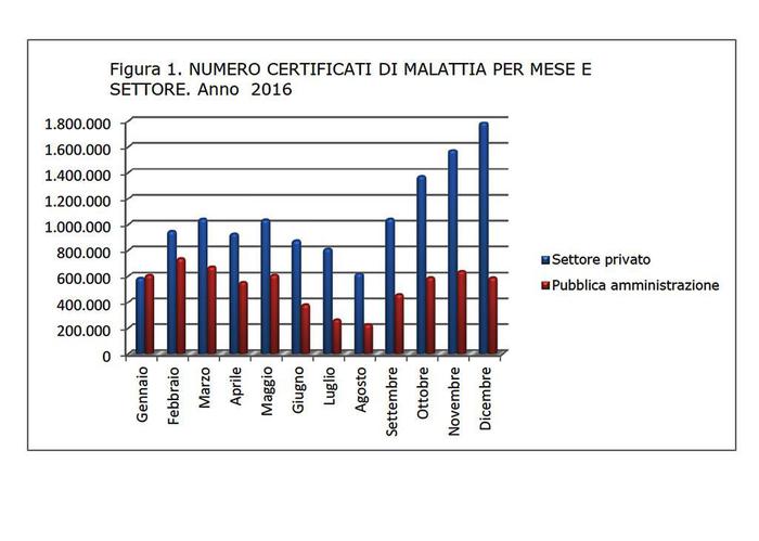 Il numero di lavoratori del settore privato che nell’anno 2016 hanno avuto almeno un evento di malattia è risultato pari a 4,4 milioni, mentre nel comparto pubblico i lavoratori con almeno un evento di malattia nel 2016 sono stati 1,8 milioni.