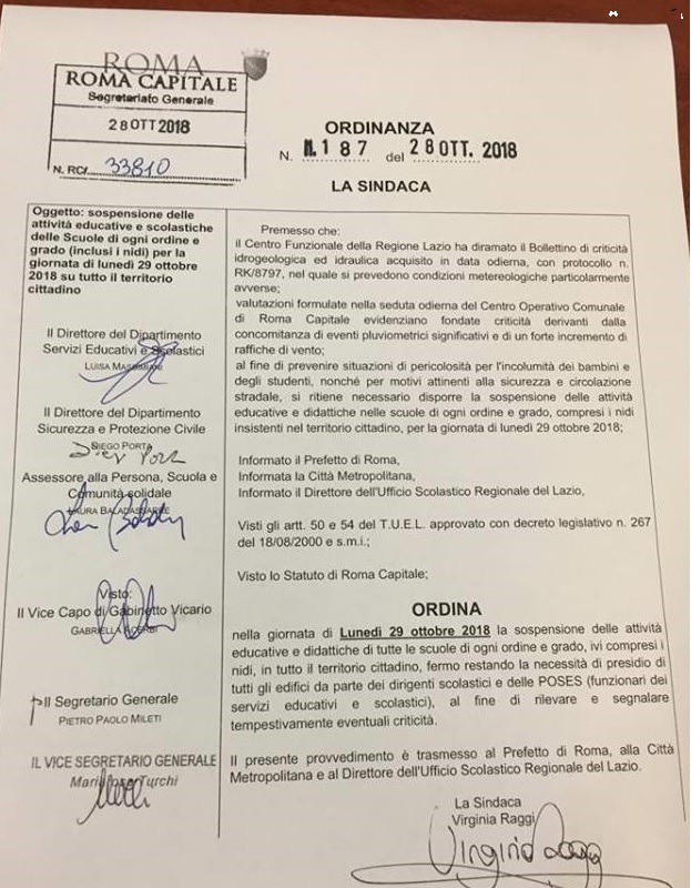 Ha destato disorientamento la modalità adottata dalla sindaca di Roma, Virginia Raggi, di mancato svolgimento delle lezioni per due giorni consecutivi, il 29 e 30 ottobre, a seguito dell’allerta meteo.