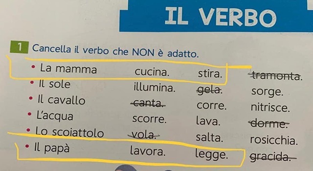 “Mamma cucina e stira”, “papà lavora e legge”, “Cancella il verbo che non è adatto”: questo esercizio di grammatica, stampato su un libro di seconda primaria di quest’anno scolastico, sta creando lo scompiglio sui social. Non è la prima volta, perché già in autunno circolò. Solo che stavolta è diventato virale.
