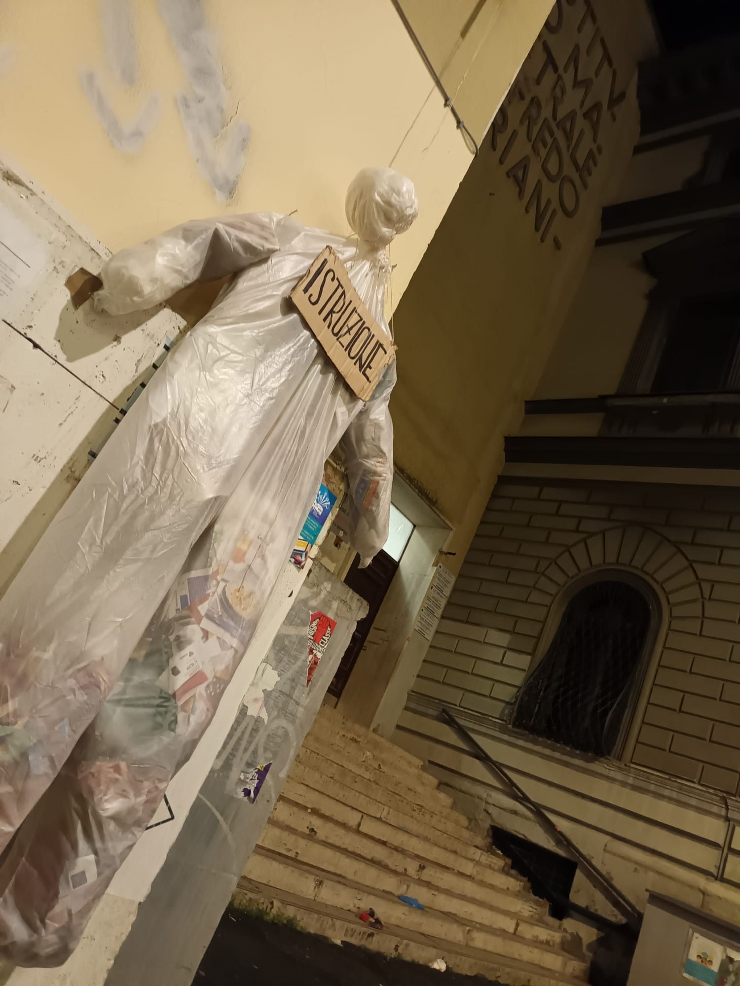 Nella notte tra l’11 e il 12 dicembre sono apparsi in tutta Roma degli striscioni e dei manichini impiccati costruiti con buste e cartacce con addosso un cartello con la scritta “istruzione“. Questo è il modo con cui Blocco Studentesco, l’associazione degli studenti ex organo studentesco di CasaPound, come ha spiegato in un comunicato, ha deciso di protestare contro l’operato del ministro Valditara.