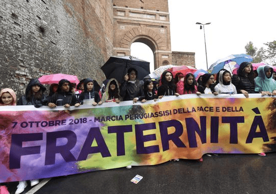 Con lo slogan “Fermatevi! La guerra è una follia”, scritto anche nello striscione in apertura del corteo, è partita oggi l’edizione straordinaria della Marcia Perugia Assisi della pace e della fraternità, voluta per gridare il cessate il fuoco nella guerra in Ucraina.