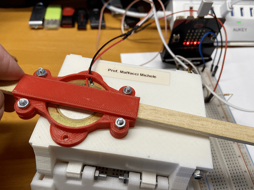 Questo dispositivo è realizzato con un componente elettronico semplicissimo che fornisce una tensione elettrica ai suoi campi se soggetto a vibrazione o a compressione, tutto con pochi centesimi di elettronica. Questo sensore è stato poi inserito all’interno di un involucro stampato in 3D ed il tutto connesso ad una lunga e sottile bacchetta di legno che costituisce l’elemento vibrante che “sente” le vibrazioni esterne.