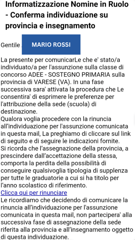 La rinuncia alla nomina in ruolo, quindi alla provincia indicata nella mail, come anche la sua accettazione, ovvero la non rinuncia, comporta la perdita della possibilità di conseguire qualsivoglia tipologia di supplenza per tutte le gratuatorie, compresi eventuali interpelli, per l’anno scolastico 2025-2026.