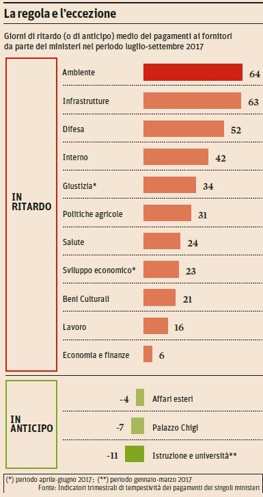 In base ai dati del Sole 24 Ore, sulla base degli indicatori trimestrali di tempestività dei pagamenti dei singoli ministeri, tra luglio e settembre, lo stesso ministero dell’Economia, titolare della vigilanza sulla macchina dei pagamenti, ha sforato in media di 6 giorni i termini di legge.
