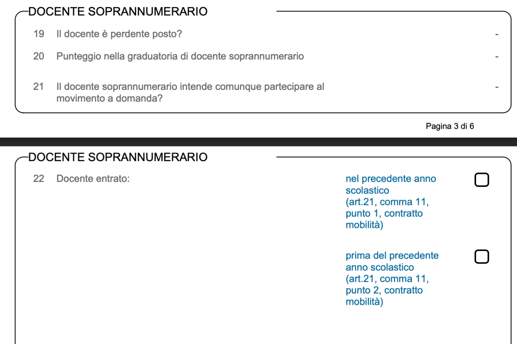 Il soprannumerario, qualora abbia interesse a permanere nella scuola di attuale titolarità, ed intenda pertanto partecipare al movimento solo a condizione che permanga la sua posizione di soprannumero nel corso del movimento medesimo, dovrà rispondere negativamente alla domanda riportata nella relativa casella della sezione del modulo-domanda. La domanda posta nel modulo è quella del punto 21 dell’immagine seguente: “Il docente soprannumerario intende comunque partecipare al movimento a domanda?”. Per condizionare la domanda ad un rientro con precedenza, sia in fase di utilizzazione, ma anche di rientro con le domande di mobilità dei 10 anni successivi, bisogna rispondere NO.