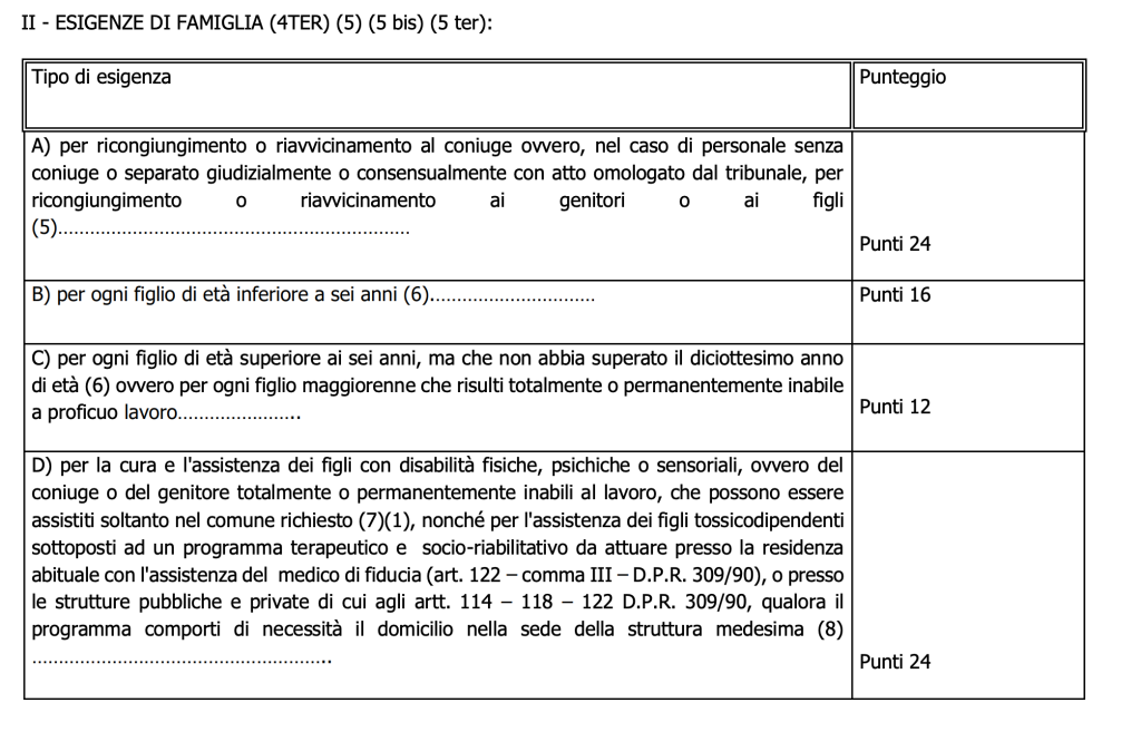 Quindi nel caso specifico dell’assistente amministrativo X, per il comune Y avrà 24 punti di ricongiungimento alla moglie e 28 punti (16+12) per i due figli. In buona sostanza per le esigenze di famiglia avrà 52 punti per il comune Y.