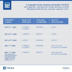 NoiPA ha pubblicato un’infografica in cui spiega quando sarà applicato il conguaglio fiscale risultante dal modello 730/2019.