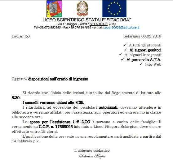 A Selargius, in provincia di Cagliari, il preside ha deciso di porre rimedio ai ritardatari cronici (e senza giustificazioni): no agli alunni giunti a scuola con ritardo. Al Liceo Scientifico Pitagora, il dirigente scolastico, Salvatore Angius, ha emanato una circolare, l’8 febbraio, ma resa esecutiva il 14 febbraio destinata a far discutere.