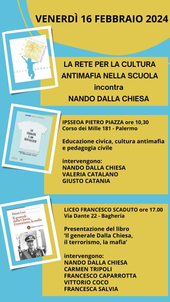 Alle 17.00 Nando Dalla Chiesa sarà ospite del Liceo Classico Francesco Scaduto di Bagheria (via Dante, 22) per presentare il libro “Il generale Dalla Chiesa, il terrorismo, la mafia”, scritto da Vittorio Coco, docente di storia contemporanea all’Università di Palermo.