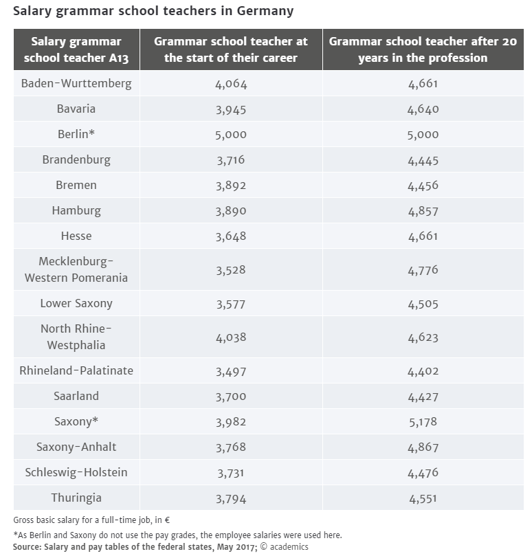 Berlino paga intorno ai 5100 euro lordi che, in funzione del tipo di assicurazione sanitaria, situazione familiare e classe fiscale, si traducono in circa 3000 euro netti. Il guadagno è inferiore a quello di altri Länder, il numero di ore di insegnamento e le mansioni accessorie superiori.