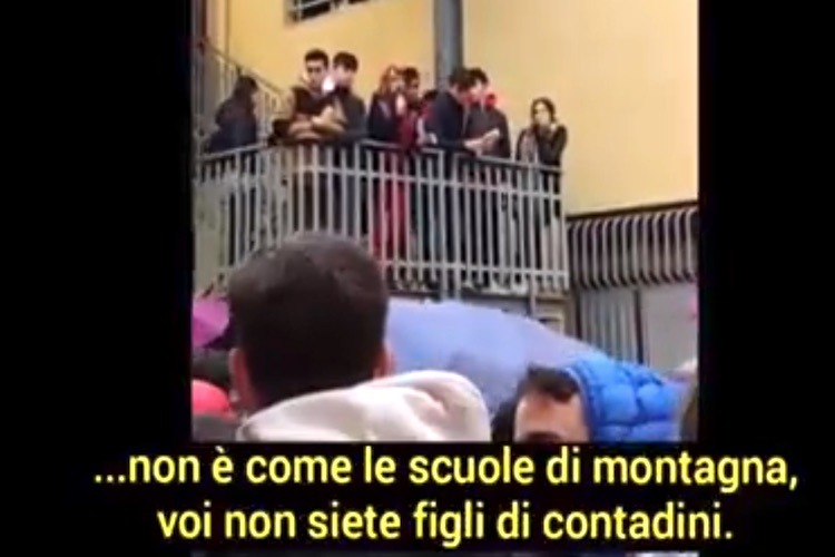 In un’assemblea autoconvocata dagli studenti, che contestavano anche la richiesta di denaro, 75 euro, per un contributo alle spese della scuola (25 per il gasolio) la preside al microfono dal pianerottolo della scala antincendio ha detto: “Si tratta – ha detto – solo di 50 euro, il costo di un caffè a settimana, non credo che le vostre famiglie non possano permettersi un caffè al giorno”. E poi la frase incriminata: “Questo è un liceo di alto prestigio, non è come le scuole di montagna, non siete figli di contadini”.