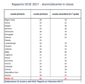 Il dato medio europeo, secondo il rapporto OCSE 2016, è di 14 studenti per insegnante.