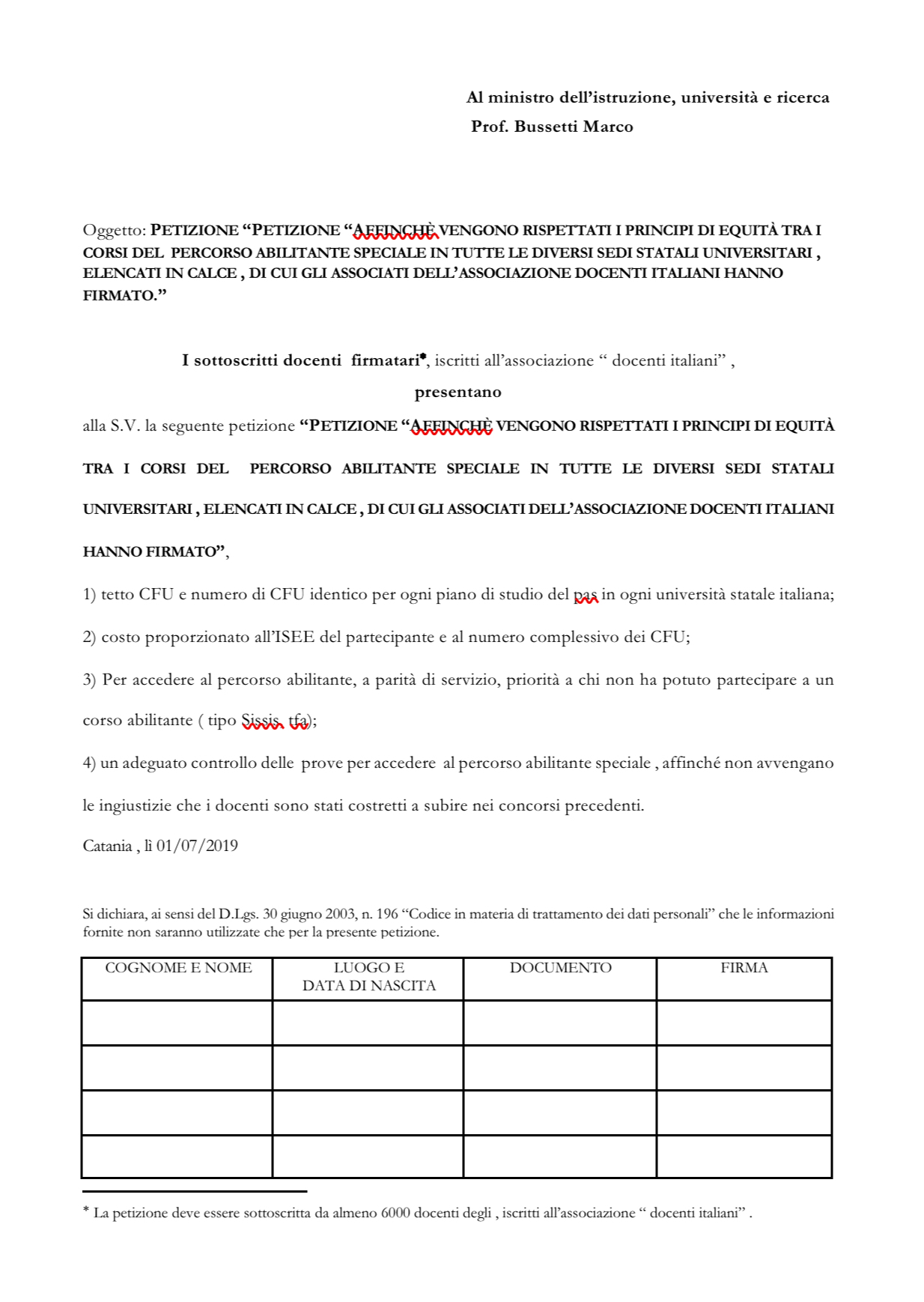 L’associazione “docenti italiani“ su segnalazione di alcuni suoi associati, ha promulgato una petizione da presentare al ministro della pubblica istruzione Marco Bussetti, riguardo il pas, percorsi abilitanti speciali, per evitare alcune criticità riscontrate nel precedente pas avvenuto nel 2013 e nuovi criticità che sicuramente ci saranno in questo odierno.