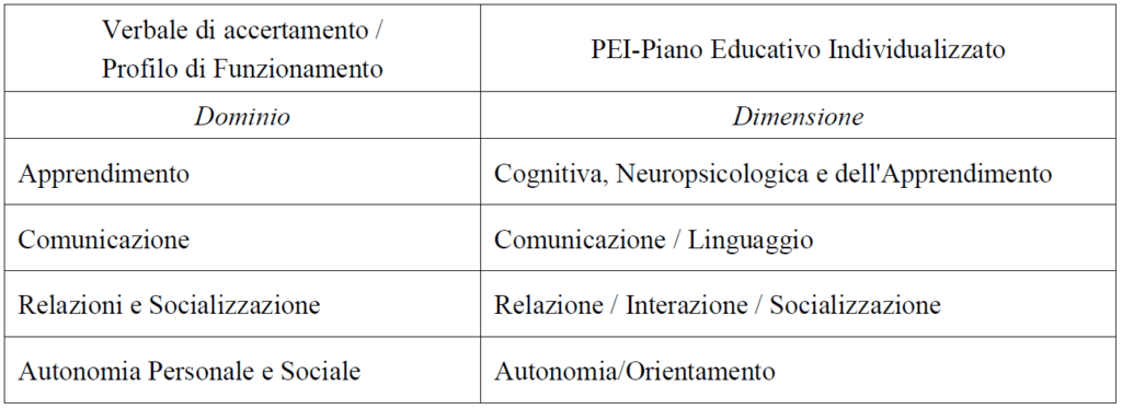I “Domini” richiamati nelle Linee guida per la redazione della certificazione di disabilità in età evolutiva ai fini dell’inclusione scolastica e del profilo di funzionamento, adottate con decreto interministeriale del 14 settembre 2022, già indicati nella legge n. 104 del 1992, corrispondono alle “Dimensioni” di cui al presente articolo, secondo quanto di seguito riportato: