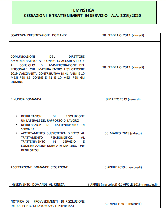 Le domande di cessazione dal servizio a qualsiasi titolo, quelle di trattenimento in servizio oltre il limite di età (nei ristretti limiti sopra evidenziati in cui siano ancora ammissibili) e quelle di trasformazione del rapporto di lavoro in tempo parziale per il personale tecnico e amministrativo con contestuale riconoscimento del trattamento di pensione, ai sensi del decreto 29 luglio 1997 n. 331 del Ministro per la Funzione Pubblica, dovranno essere presentate all’istituzione di titolarità entro e non oltre il 28 febbraio 2019; tutte le domande presentate valgono, per gli effetti, dal 1° novembre 2019.
