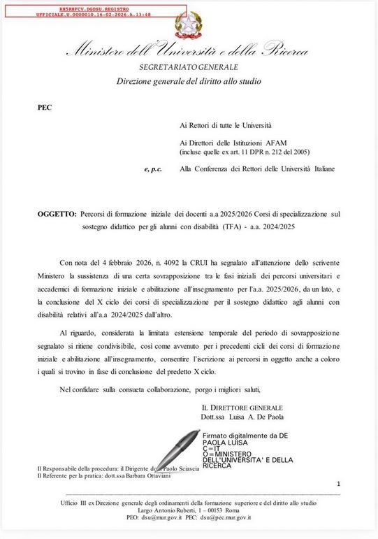 A seguito della segnalazione da parte della Conferenza dei rettori delle università italiane (CRUI), il MUR è intervenuto sul problema della doppia iscrizione ai percorsi di formazione iniziale dei docenti a.a. 2025/2026 e ai corsi di specializzazione sul sostegno didattico per gli alunni con disabilità (TFA). La medesima problematica è stata segnalata dalla FLC CGIL.
