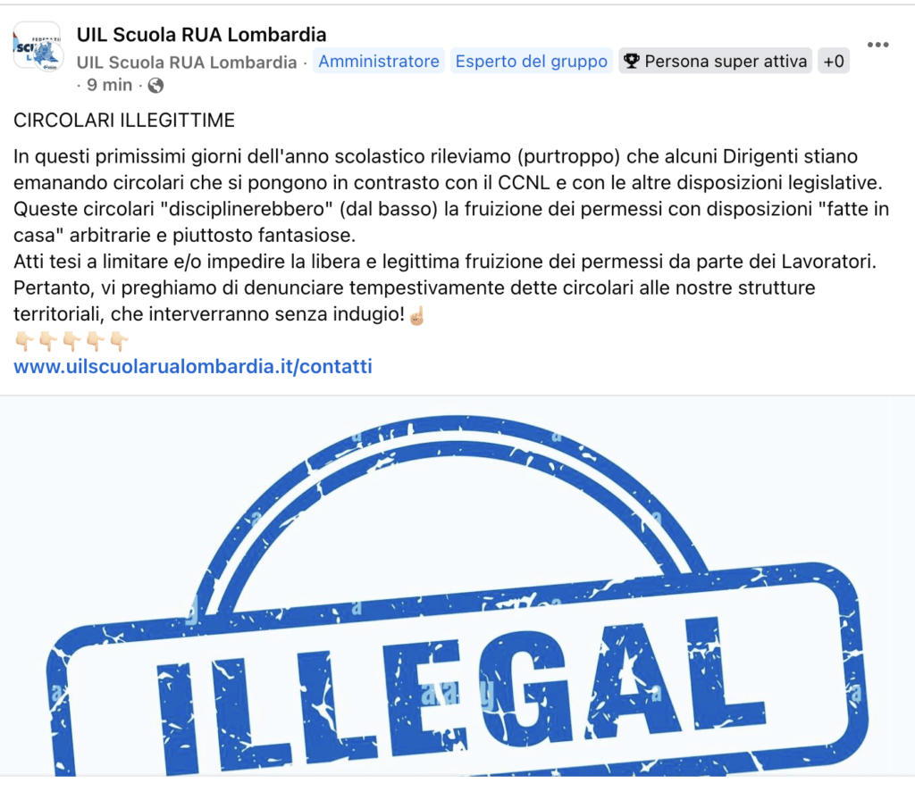 L’anno scolastico 2025/2026 non è ancora iniziato e già si parte con le contestazioni sindacali contro alcune circolari dirigenziali, ritenute inopportune e illegittime. A tal proposito spunta, nel gruppo Facebook Uil Scuola Rua Lombardia, un curioso post che invita a denunciare quelle circolari dirigenziali illegittime e volte a non rispettare le norme legislative e contrattuali. Nel mirino sindacale sono alcune circolari che andrebbero a limitare il diritto dei docenti a fruire dei permessi retribuiti per motivi familiari e personali.