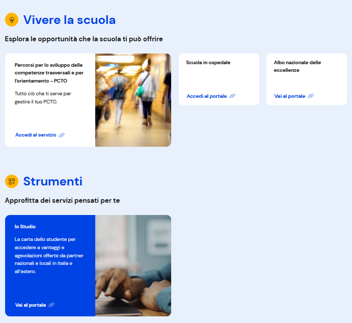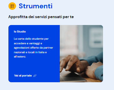 Infine, in Strumenti, lo studente può collegarsi al portale Io Studio, la Carta dello Studente nominativa che consente di attestare il tuo statusdi studente in Italia e all’estero e di usufruire di vantaggi e agevolazioni offerte dai partner nazionali e locali aderenti al progetto.