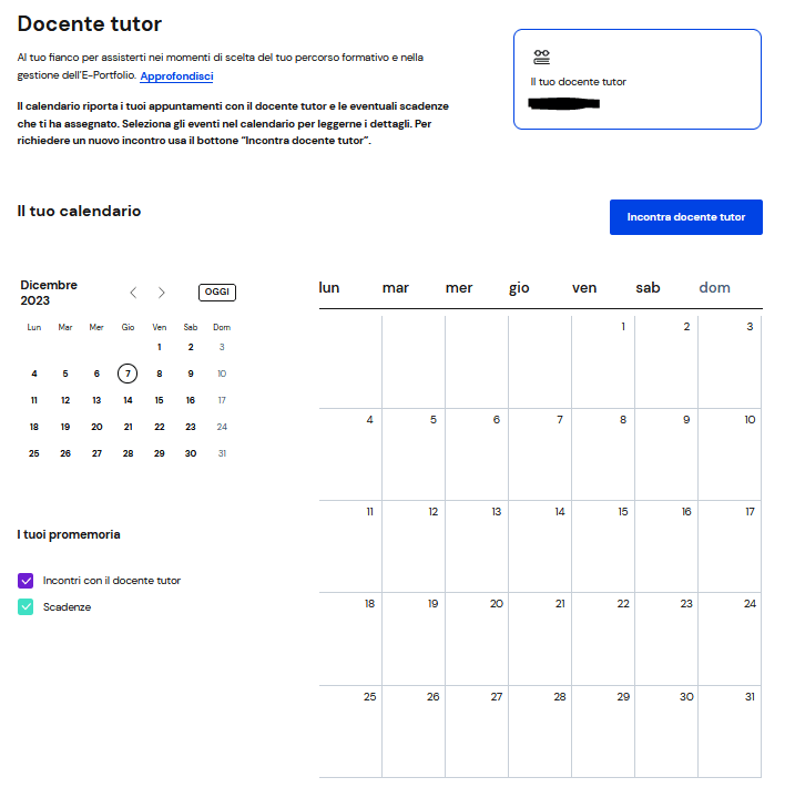 La sezione tutor riporta tutti gli appuntamenti e dà la possibilità allo studente di fissare un appuntamento con il tutor.