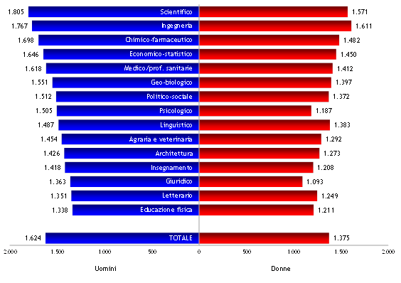 Le differenze di genere si confermano anche dal punto di vista retributivo. Infatti, tra i laureati magistrali biennali che hanno iniziato l’attuale attività dopo la laurea e lavorano a tempo pieno emerge che il differenziale, a cinque anni, è pari al 19% a favore dei maschi: 1.637 euro contro 1.375 euro delle donne.