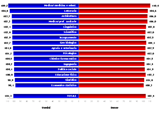 Infatti, fra i laureati del 2016, dove è nettamente più elevata la presenza della componente femminile (59%), la quota delle donne che si laureano in corso è superiore a quanto registrato per gli uomini (rispettivamente il 51% e il 46%) mentre il voto medio di laurea è uguale a 103,4 su 110 per le prime e a 101,3 per i secondi; occorre sottolineare che ciò è frutto anche dei diversi percorsi formativi intrapresi.