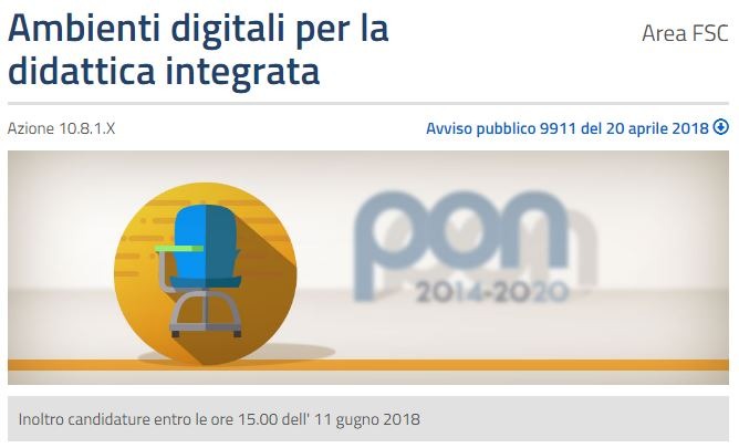 Il 20 aprile scorso il Miur ha pubblicato l’avviso PON per offrire alle istituzioni scolastiche l’opportunità di acquisire dispositivi digitali e arredi scolastici che consentano di aggiornare o sostituire le dotazioni delle aule e di altri ambienti della scuola, anche al fine di creare spazi individuali, di gruppo e laboratoriali e di favorire l’uso delle più innovative strategie didattiche, nonché di supportare in chiave innovativa le attività didattiche e amministrative.