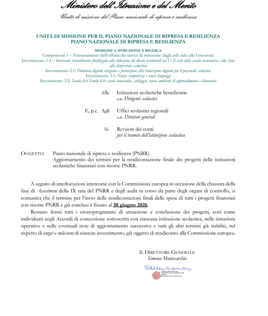 Come abbiamo appensa scritto, i finanziamenti PNRR per le scuole terminano definitivamente il 30 giugno 2026, termine ultimo per il completamento di progetti, obiettivi e la relativa rendicontazione finale. Dopo il 30 giugno i fondi non utilizzati verranno revocati e le spese non correttamente documentate non saranno rimborsate. La Corte dei Conti sta monitorando e controllando il corretto utilizzo dei fondi e la capacità amministrativa delle segreterie scolastiche.