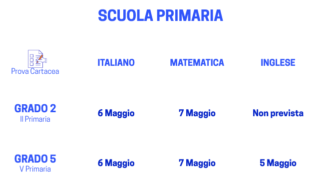 Maggio sarà invece il mese della scuola primaria, che mantiene il tradizionale formato cartaceo: le prove si concentreranno tra il 5 maggio (Inglese per la V primaria), il 6 maggio (Italiano per II e V) e il 7 maggio (Matematica per II e V).