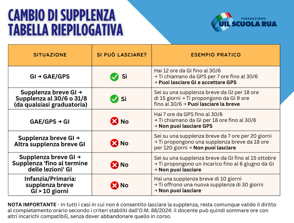 In tutti i casi in cui non è consentito lasciare la supplenza, resta comunque valido il diritto al completamento orario secondo i criteri stabiliti dall’O.M. 88/2024: il docente può quindi sommare ore con altri incarichi compatibili, senza dover abbandonare quello in corso.